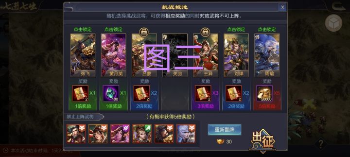 4.重点。每次七进七出,要刷满300+400元宝加次数,主要刷拜帖和粮食,拜帖优先,方法每关有乘2陪的就锁定,当刷到十张就可以打了一轮下来七十到一百多看运气了,我每轮平均一千元宝)刷完基本两三百,十五天三次活动就有六百加张。(图三)