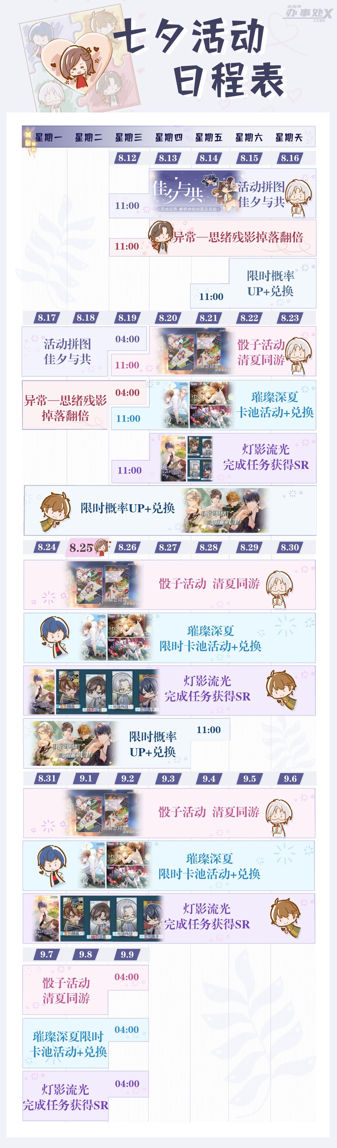 今年的七夕有点忙啊,现有拼图赶赶,又有抽卡哭哭。不要彷徨,不要悲伤,大家领好cxbs的日程表,七夕一定很难忘~