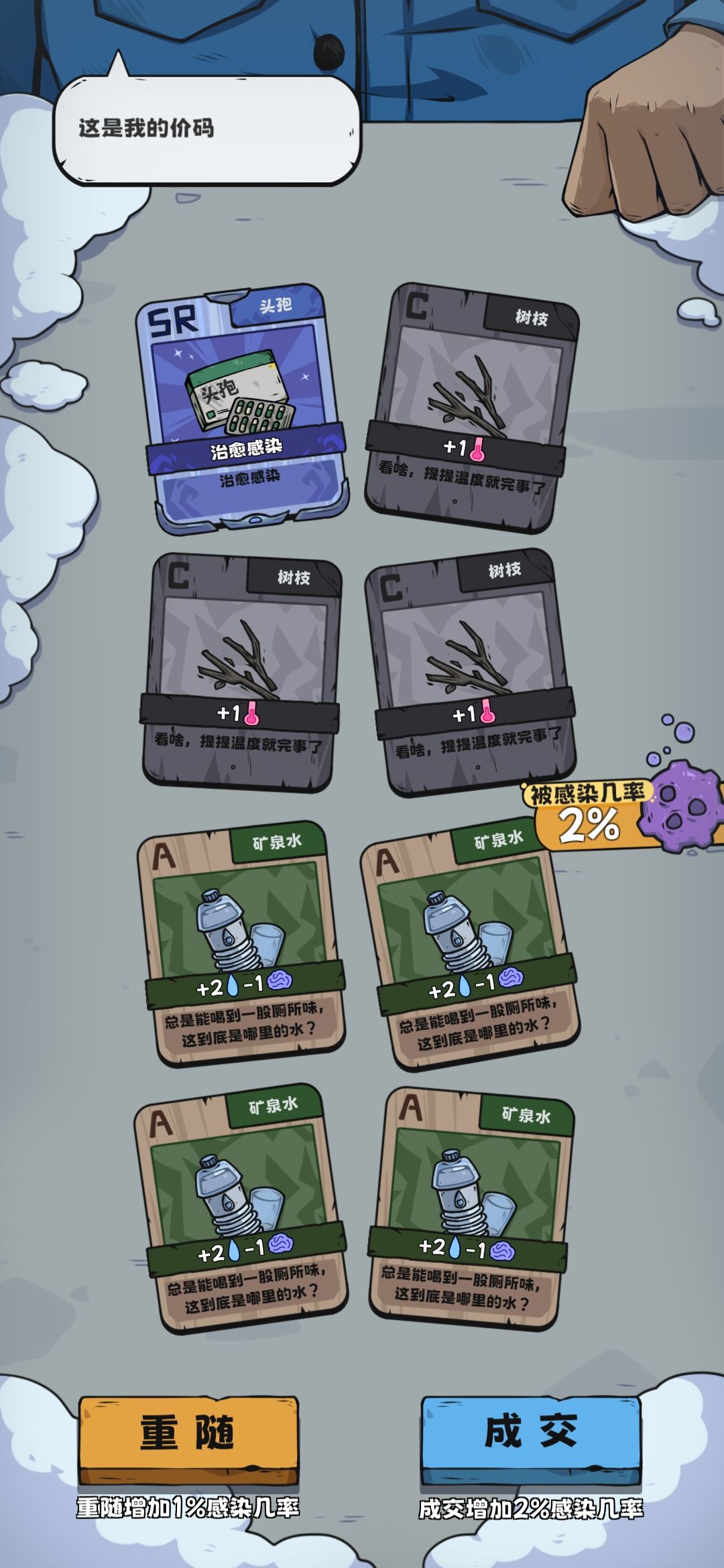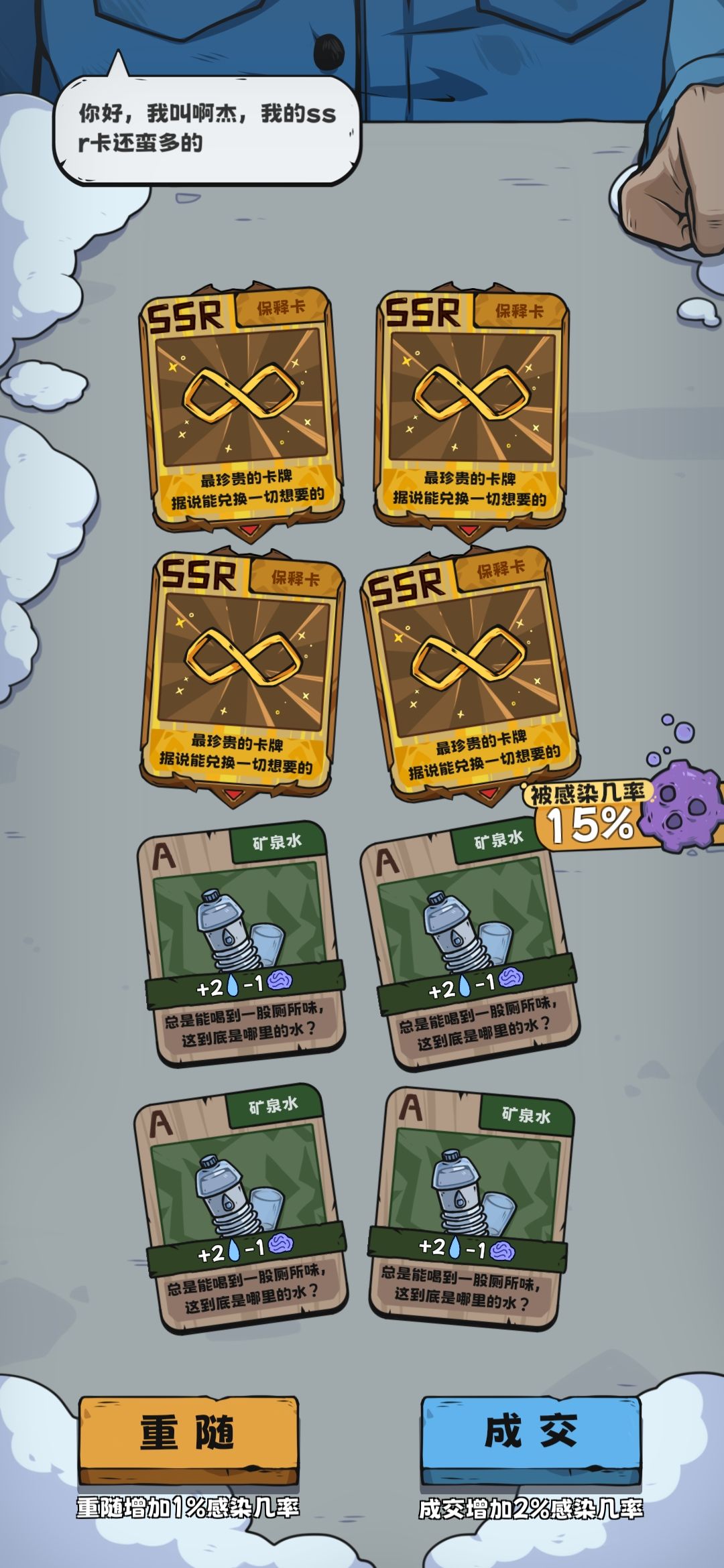 因为之前找典狱长贷款,所以会抽到很多卡,其中压缩饼干,矿泉水和薄荷糖会很多,而且这几种卡价值也不高,随便嚯嚯