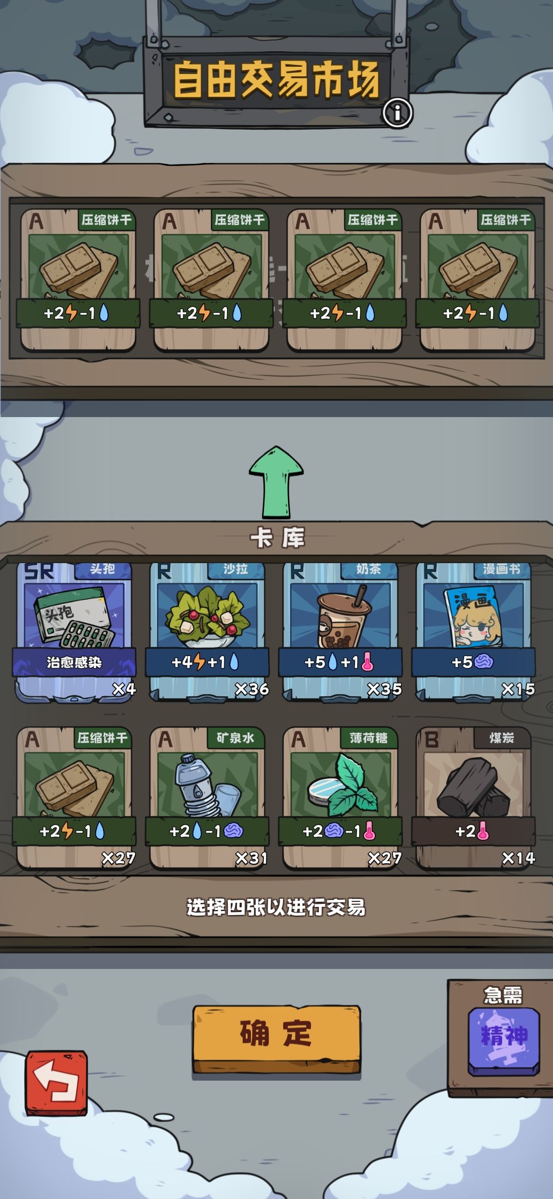 在交易区交易之前右下角可选精神和药品,如果卡多可以酌情换一点镇定剂和抗感染药,如果有2张及以上的煤炭也可以换(用于和黑帮老大换SSR卡)。