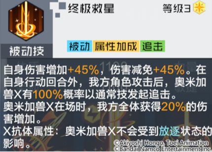 那么,除了奥义技,还能如何增加标记层数呢?答案就是通过被动技——终极救星。自身回合外,我方角色攻击后,奥米加兽X有100%概率以通常技发起追击。