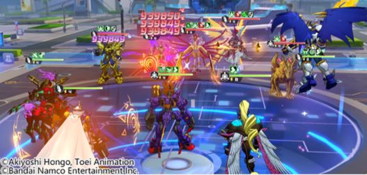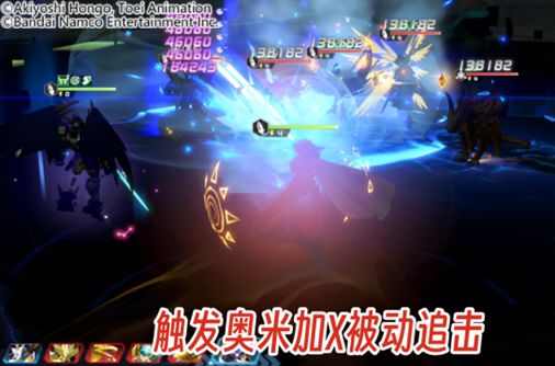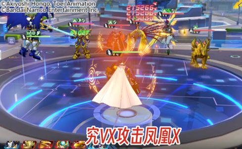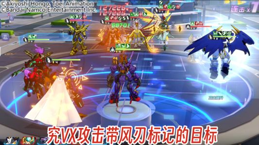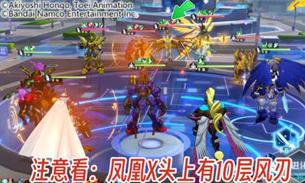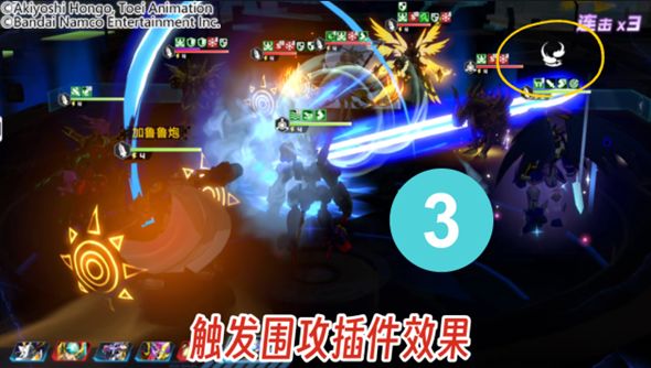 如图七所示,究极V龙兽X攻击带风刃标记的目标,先触发了图八中的疫苗种连击;接着,触发奥米加兽X自身追击(图九);最后是围攻插件效果(图十),共计叠加三层。