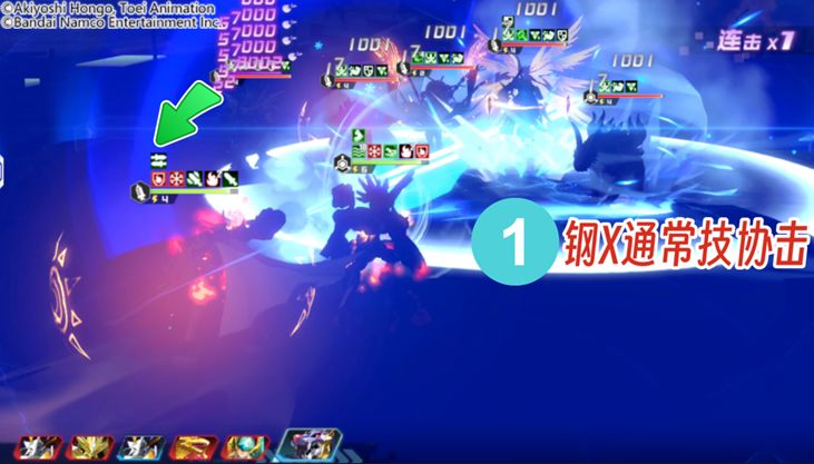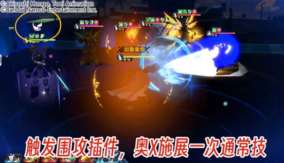 首先,解释下主动协击技能,例如钢铁加鲁鲁兽X、雷电兽和莫斯提兽等的通常技,带有协同队友进行攻击的技能,这里钢叔以钢铁加鲁鲁兽X为例,给大家作一说明。钢铁加鲁鲁兽X发动通常技(图十一),协同攻击最高的队友(包括奥米加兽X)以通常技攻击一次;随后,触发奥米加兽X的被动追击(图十二);最后,是围攻插件效果(图十三),叠满三层“绝对零度”。