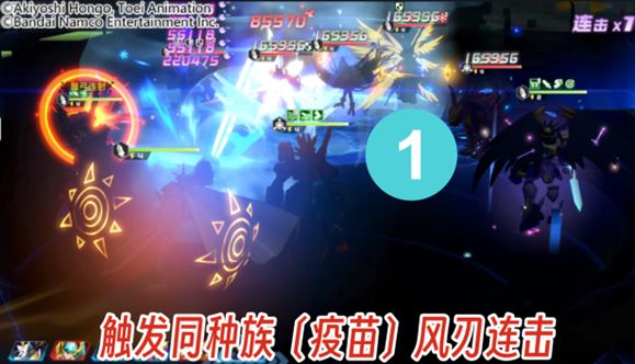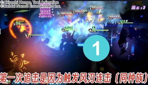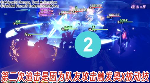 图一中,究极V龙兽X攻击有风刃标记的凤凰兽X,触发风刃连击,且此处正好触发同种族连击,奥米加兽X和究极V龙兽X都是疫苗种,所以平A一次加1层标记;然后,因为检测到队友攻击,奥米加兽X触发被动追击,故施展通常技,再叠1层。