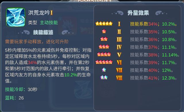 宠物技能:洪荒龙吟5秒内增加5%的元素减伤并免疫控制;对指定区域释放水龙卷持续5秒,每秒对区域内的敌人造成34%的水元素伤害,并在第2秒和第5秒对范围内的敌人进行牵引;并恢复区域内友方的自身水元素攻击10.2%的生命值。
