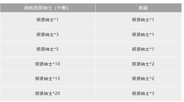 活动期间,累计消耗一定数值的「招贤纳士」将可以获得对应数量的「招贤纳士」。
