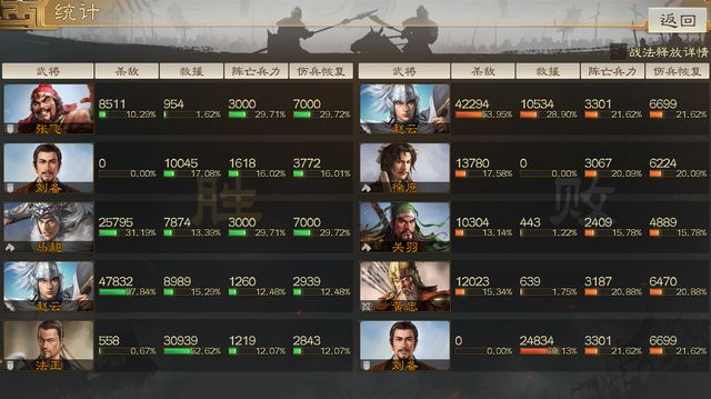 赵云和马超两人共打出了将近90%的恐怖输出,尤其是可以叠加多层debuff的赵云,一人将近打出60%十分的可怕,并且在对手拥有桃园和五虎的加成下仅仅就阵亡了张飞和马超,就将对手全数剿灭,可见这个阵容的可怕之处!