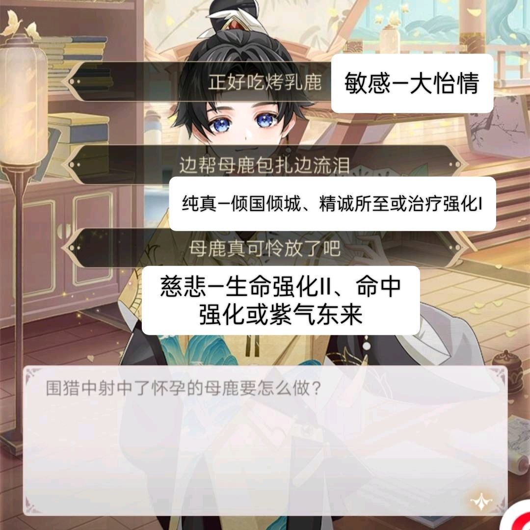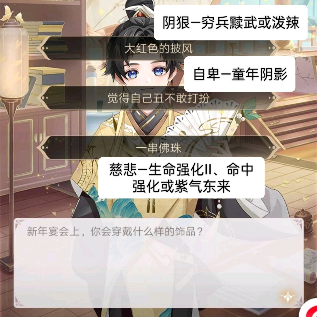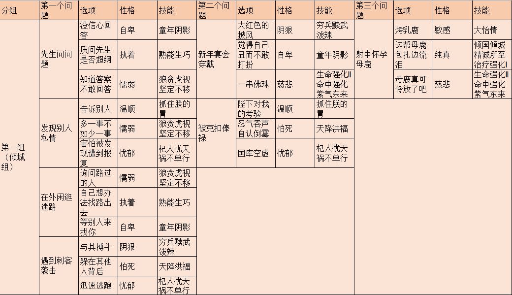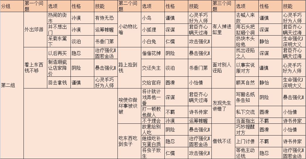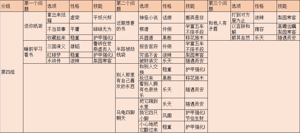 教养是离我们最近的一部分,需要我们实际操作。教养决定了凰储的性格,性格决定了凰储的技能。而我们所需要的就是技能。首先,明确一下教养。教养每次需要6本四书五经,每次教养有一个问题并附有3个选项。每位凰储最多教养3次。针对游戏来说,教养问题总共有28个,共84个选项,每个选项都有它对应的性格。值得一提的是,教养的问题是成套存在的。每位凰储的3个教养问题都只是其中的一套,不会穿插着问。问题有4套,具体分组如下: