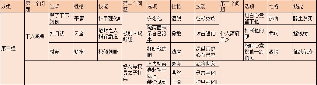 三个选项对应的性格和技能已经标明。那么可以看到,如果你想培养童年阴影技能,那么就要选择第一个选项。选择了就可以收手了。但是第一个问题的各个选项不能包含所有技能,