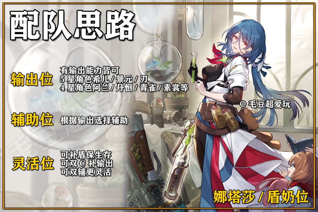 05.配队思路。首先要知道娜塔莎占的是盾奶位,理想阵容搭配为:输出+辅助+盾奶+灵活。输出和辅助位根据自己的BOX搭配,灵活位则可根据怪物的弱点、机制灵活调整。