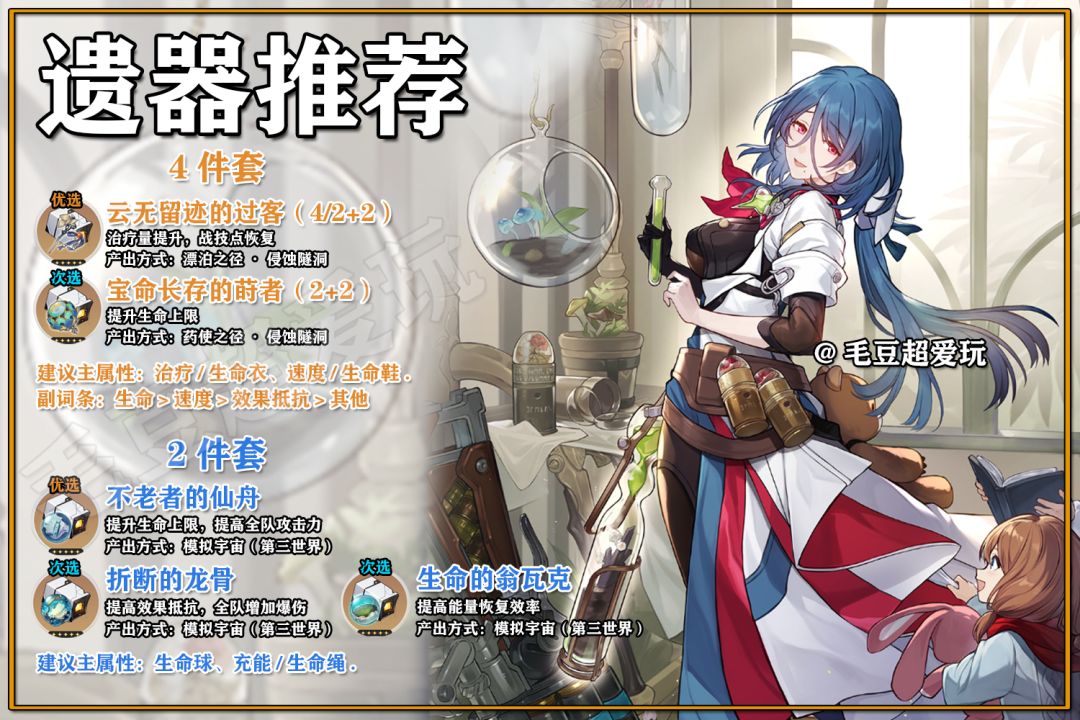 04.遗器推荐。4件套:云无留迹的过客,虽然已经是1.2版本了,但这套依然是最契合奶妈的4件套,如果你在给刃刷遗器,那也可以让娜塔莎穿用2+2过渡(变废为宝)。2件套:优选还是仙舟,次选为回能和新的龙骨套,龙骨两件套可搭配“此时恰好”光锥使用。主属性推荐:治疗/生命衣、速度/生命鞋、生命球、充能/生命绳。