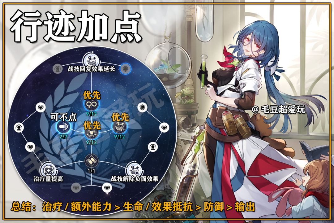 02.行迹加点。娜塔莎的行迹还是很好理解的,治疗和额外能力优先升级、点亮,生命/效果抵抗加成为次级,普攻可不点。