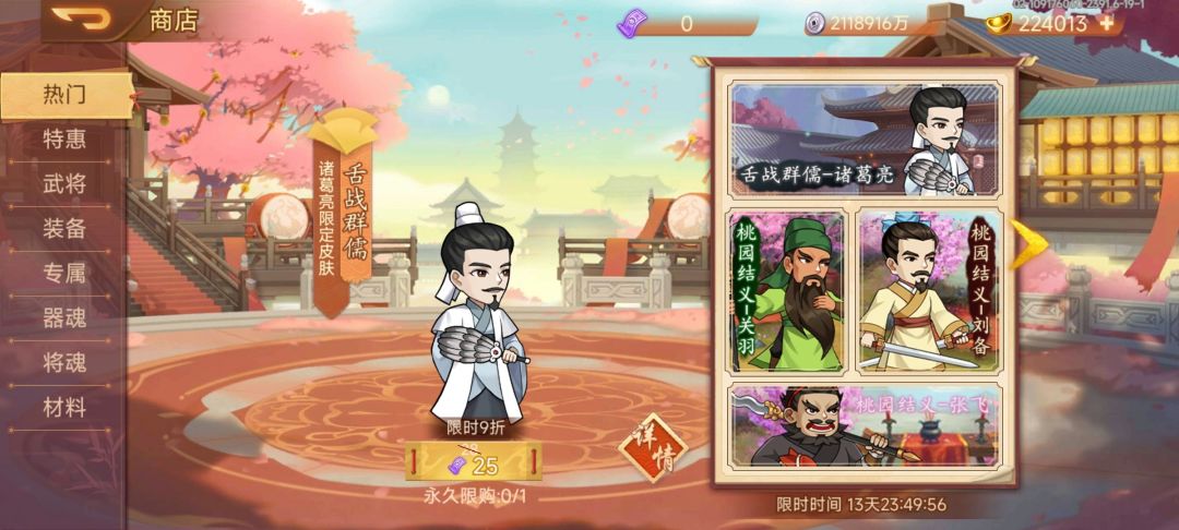 活动内容:诸葛亮、关羽、刘备、张飞限定皮肤商城热卖!