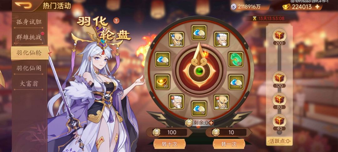 活动内容:活动期间,消耗六壬式盘转动轮盘,抽取奖励!蓝珍珠可在羽化仙阁内兑换珍稀道具哦!