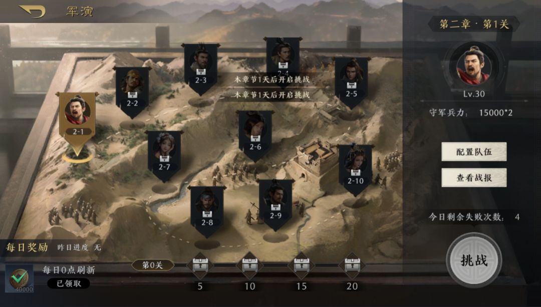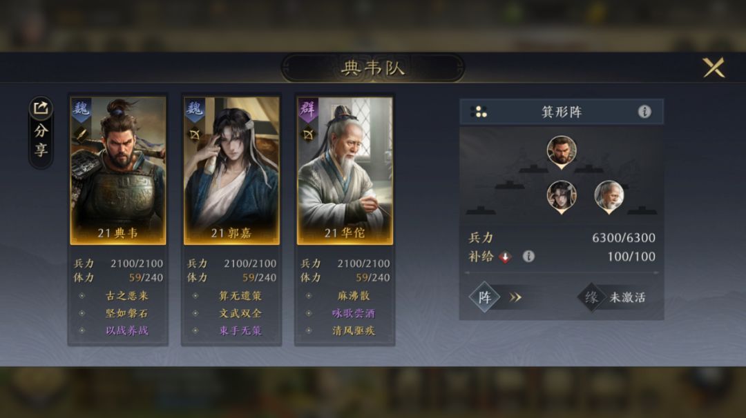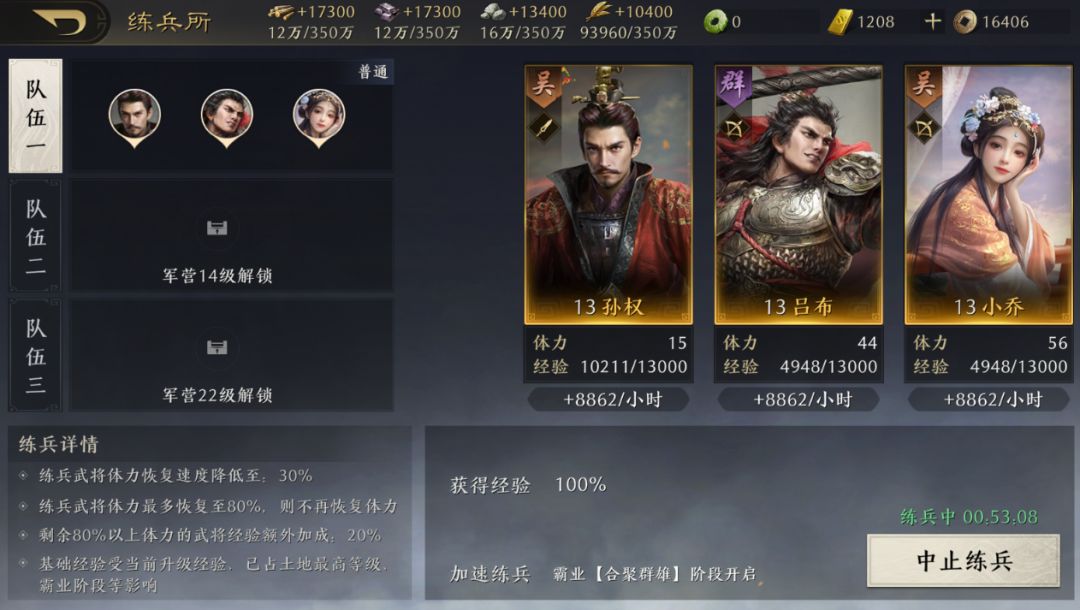 同时,由于前期铜币缺乏,无法支持两队同时出战,因此,主公们可以将第一队的体力刷光然后放到练兵所练级(前期不要开加速),然后将所有战法重置投入到第二队继续练级。第三队前期用作屯兵队即可,前期不建议投入过多资源(前期兵力十分缺乏)。