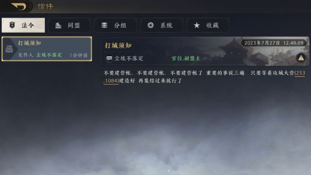 因此,主公们的第三队需要随时待命,按照同盟管理选定的坐标前往修建营地/参与同盟攻城。在同盟占领第一座城池以后,建议立刻使用迁城功能来到同盟城池附近,与盟友聚集,既可互相保护,亦方便统一行动。