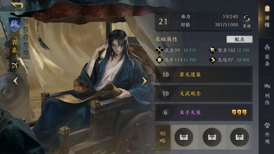待铜币充足时,优先将全部战法等级提升到7级,然后是10级,这样的点法可以稳定的提高队伍战力,不会产生短板。