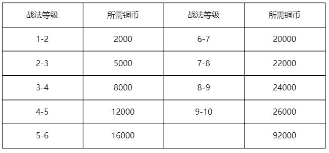 战法升级所需要的铜币数量是随着战法等级大幅度提高的,每级战法所需要的铜币如下表所示: