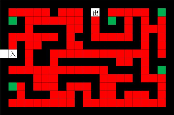 黑色是墙,红色是路,绿色是箱子,白色是出入口