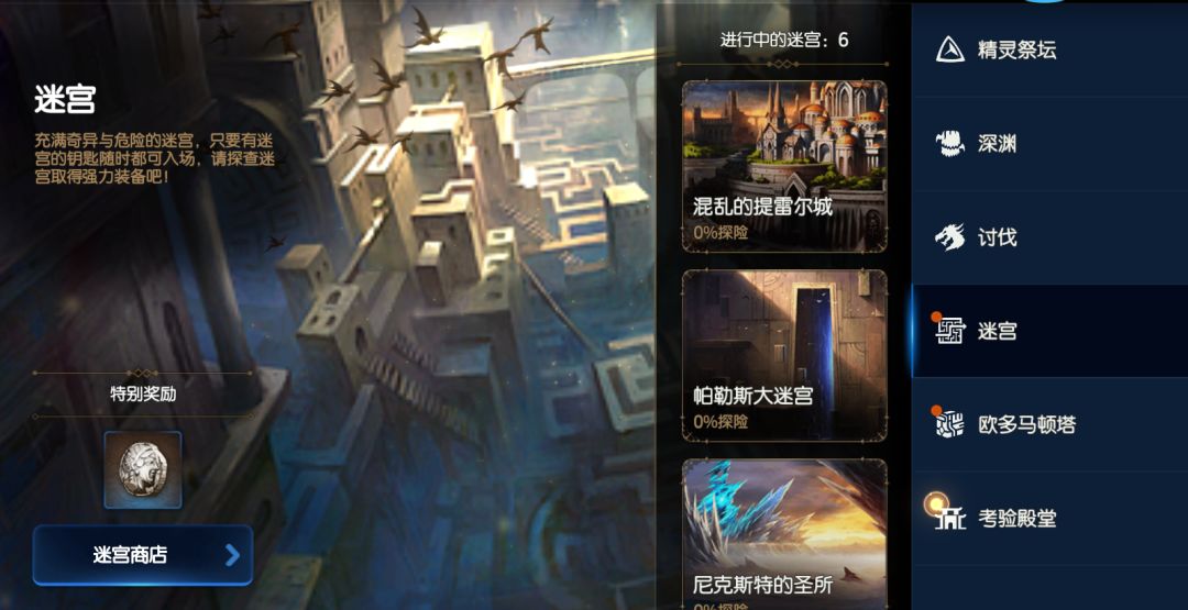 在完成1-3-1后,游戏会提示我们解锁了竞技场功能。这是一个重要节点。此时返回主菜单。我们会发现在这段时间,我们已经解锁了迷宫、深渊、精灵祭坛、骑士团、竞技场玩法。那么接下来我们来分别看一看在前期,我们应该如何快速上手这些内容。