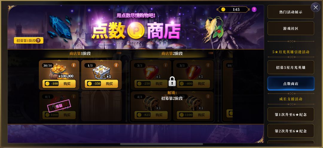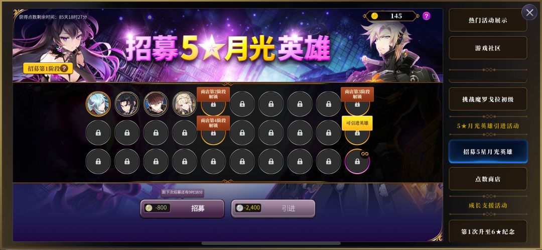 【招募5星月光英雄】重头戏来了,我们一定要点击参与。这是一个从点击参与起开始计算持续90天的活动,只需要完成游戏内的日常、周常、消耗体力,就可以获得活动点数,解锁招募阶段。同时随着招募阶段的解锁,下面的点数商店活动也会解锁对应的商品可供我们用活动点数购买。