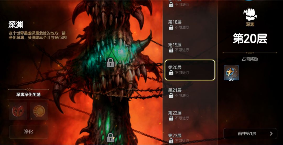 深渊玩法很简单(相当于爬塔玩法,只不过它是向下爬的),我们只需要尽可能打到高的层级,当队伍打不过之后即可收手。每日刷新3张票,我们之后只需要点一次净化就可以拿到金币与雌蕊圣叶(红叶)奖励。