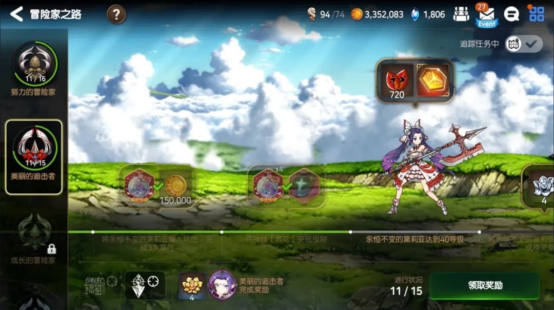 我们的第一支推图队伍有四人:拉斯、伊赛利亚、幻影的泰妮布里雅、永恒不变的黛莉亚。拉斯作为男主,开局即送。在完成主线1-1-2后,我们会解锁冒险者之路功能。在这里,我们能够根据任务引导进行角色的培养,在快速提升练度的同时并获得各类奖励。