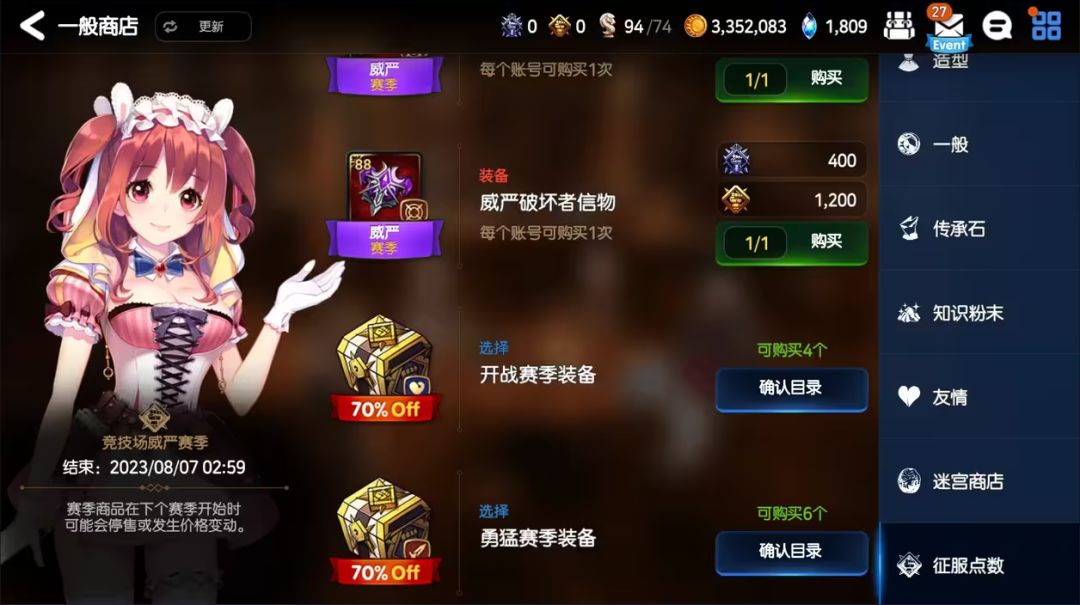 然后,我们就可以全身心的投入竞技场,我们直接使用推图的阵容即可,打到自己的练度打不动为止。在竞技场商店内,我们可以兑换许多88级的套装,这是前期高等级装备最轻松的获取来源。关于大家优先兑换哪些套装,我在后续会进行详细讲解。