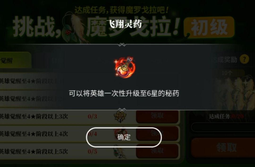 【挑战魔罗戈拉】该任务最重要的奖励便是能让角色直接升级至6星的灵药,为了能够快速完成任务,我们的角色最多觉醒3次,不要觉醒4次,等我们达到了账号等级rank25之后,这个网页活动任务便会出现,这时候我们接受了任务再觉醒4,就可以快速完成活动拿到灵药。