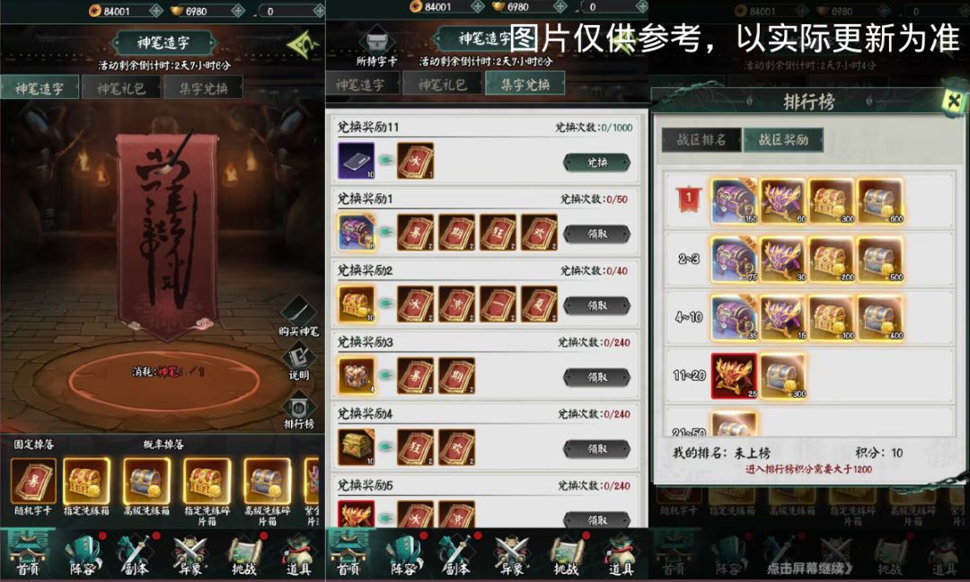 2.每次造字可以获得10积分,一张随机字卡和一个随机奖励,积分用于参加本期造字排行榜,字卡可以在集字允换里允换奖励