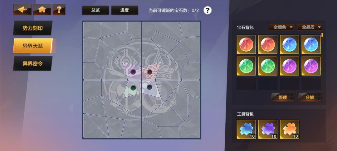 天赋宝石可以通过击败每层的阶段首领敌人获得,不同颜色的宝石需要镶嵌在对应颜色的孔位中。不过异界天赋玩法同样支持冒险者使用改色晶片更改宝石孔的颜色,或使用破坏晶片取下已经装备的宝石。