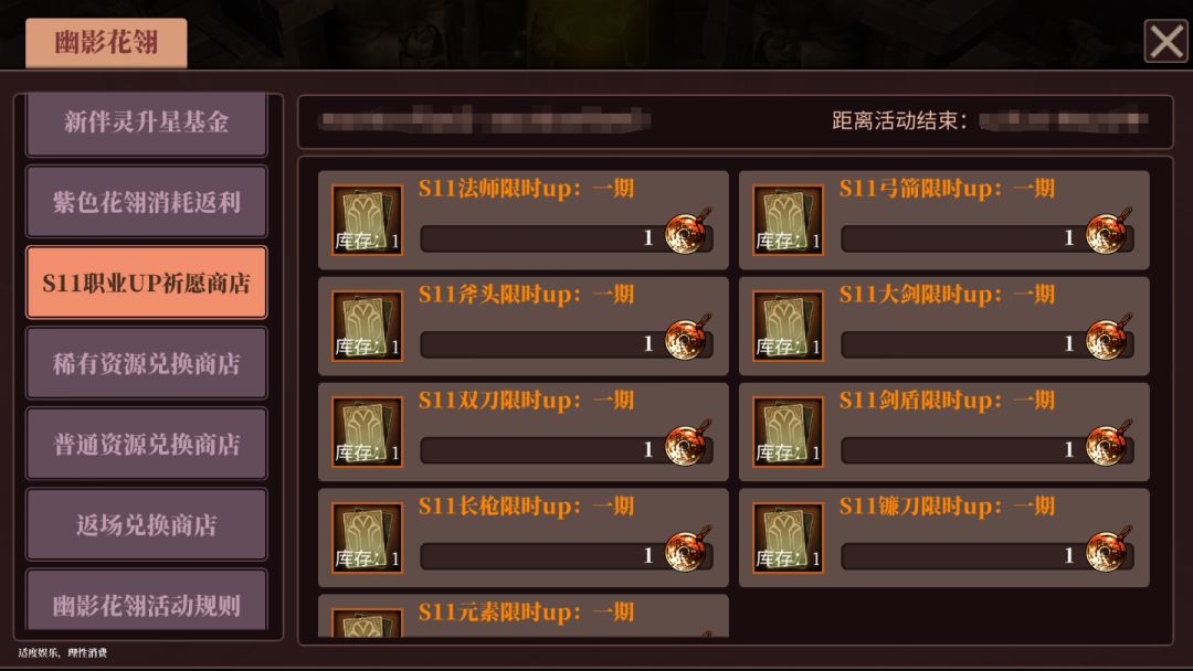 稀有资源兑换商店&普通资源兑换商店开启,消耗紫色花翎可兑换职业祈愿开启凭证、闪光粉尘、伴灵体力令牌等丰富道具奖励。