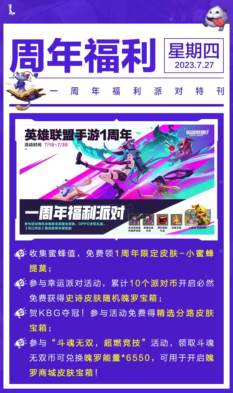 奖励:小蜜蜂 提莫,史诗皮肤随机魄罗宝箱,英雄自选礼包*3,龙魂水晶*500,限时语音礼盒