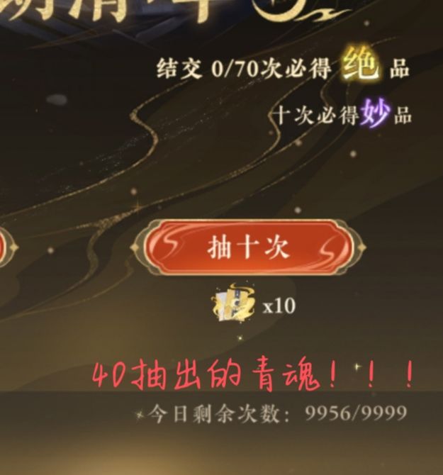不知道有没有用,反正我40抽出的,前20抽就是正正常常的抽,当然也可以不用,先攒个13,14抽啥的,然后点10连抽,再点左上角退出,一直重复四。五次就可以了,七,八次也可以,让官方误认为你已经抽了这么多抽保底了,然后单抽,一定要重复,不是重复的就删了重下,然后单抽三,四次,就10连抽(可能是新游戏的原因,反正这个可以试一下)然后我这个是新号,主要是开服没几天,应该没有人不是新的吧(手机像素好拉