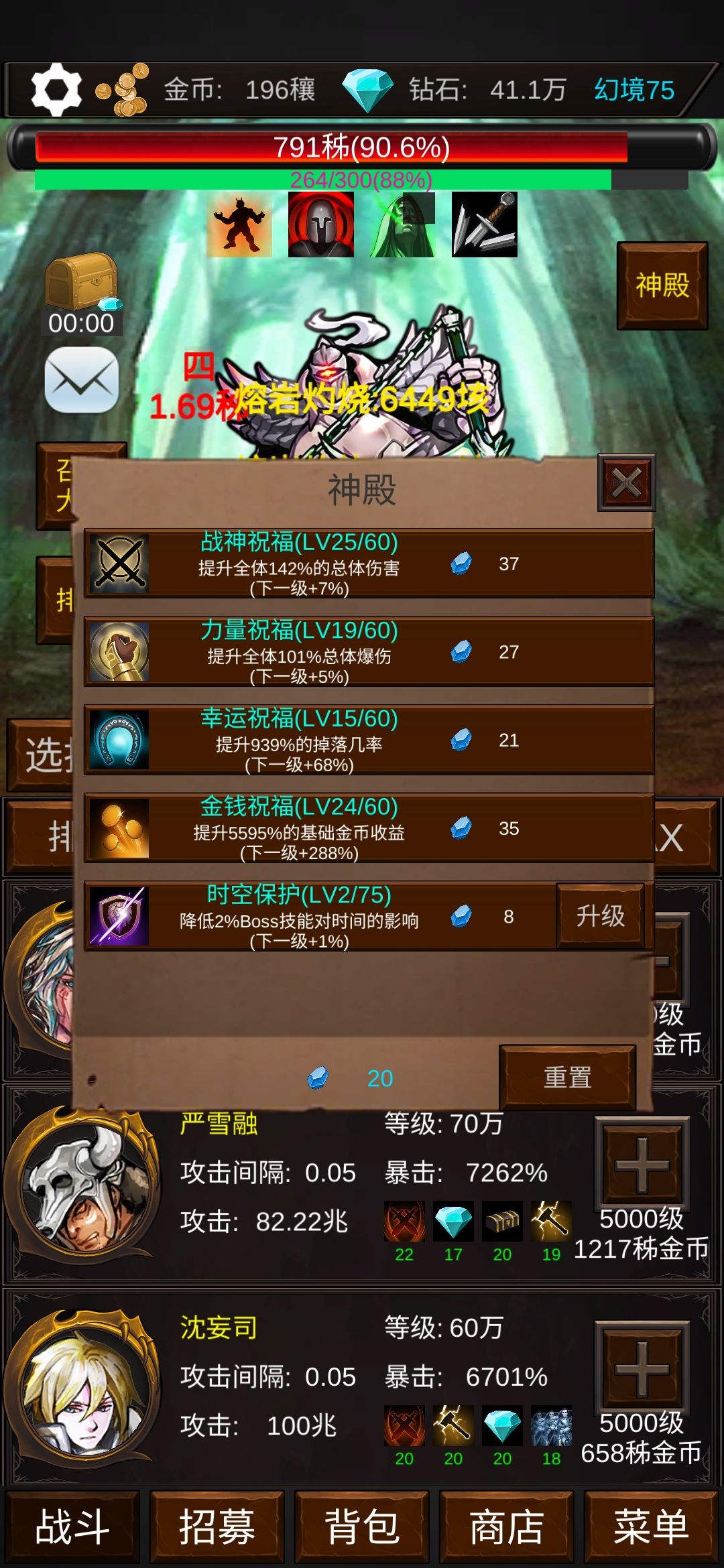套装十多层开始刷,不用纠结它,继续爬塔,30多层了再回头刷一天套装,给十多个打手带熔岩,保持输出就行了。黄金和掉落主要看神殿收益。找攻略看多少层刷蓝色和黄金打手,全换蓝色以上4天赋打手,天赋必带辅助攻击,辅助爆伤,全员鼓舞。还有一个天赋带钻石,铁匠,寻宝。