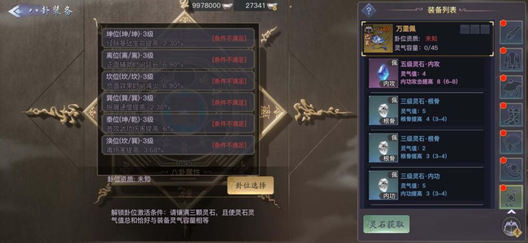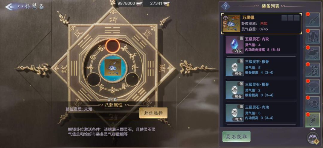 项链、戒指、玉佩卦位推荐造成伤害提高的乾位,施展速度提高的巽位。
