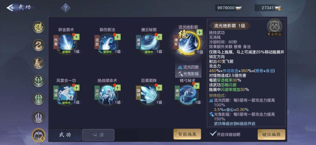登峰造极:强力推荐杨门啸风的专属秘籍,穿云秘籍,附带穿云坠月箭技能,高伤害技能,同时可以打断所有非绝技技能并封轻功,高伤害的同时还有不错的控制效果。是目前游戏中非常适合啸风的秘籍,可以一直装备,甚至不用更换出神入化的秘籍。