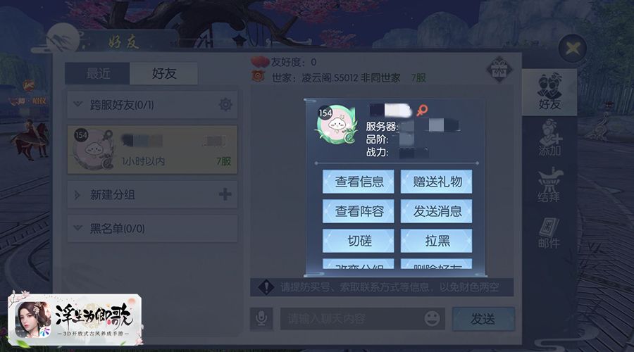 在繁华浮世间,阁下是否时常因为服务器限制与人擦肩而过,错失佳话。《浮生为卿歌》跨服社交系统现已正式上线,服务器不同再也不会成为社交的阻碍。浮云游子意,落日故人情。阁下可在左下方好友界面分组中找到自己的跨服好友,并点击头像进行聊天,与之一同体验别样浮世繁华。