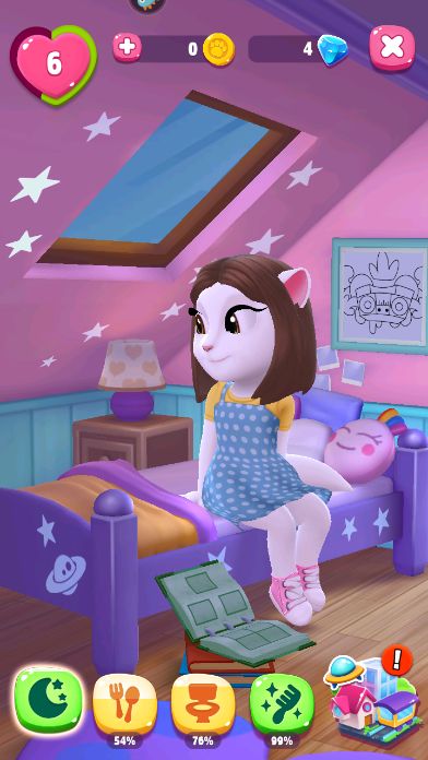 睡觉是一个比较容易让我们忽略的环节。因为一般我们都选择跳过,或者点击睡眠就开始挂机,那其实,晚上也是有很多彩蛋的。首先,我们可以不点击台灯,直接点窗外也可以触发白天和黑夜的交替。等待安吉拉入眠后,我们点其他区域,可以看到夜晚家里的环境,与白天的氛围也是有所区别,配合着微弱的灯光有一种幽静的美。