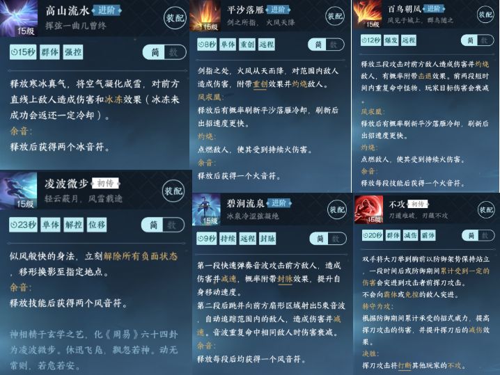 技能输出手法:广陵散>平沙落雁>百鸟朝凤>凤凰展翅>御风>碧涧流泉