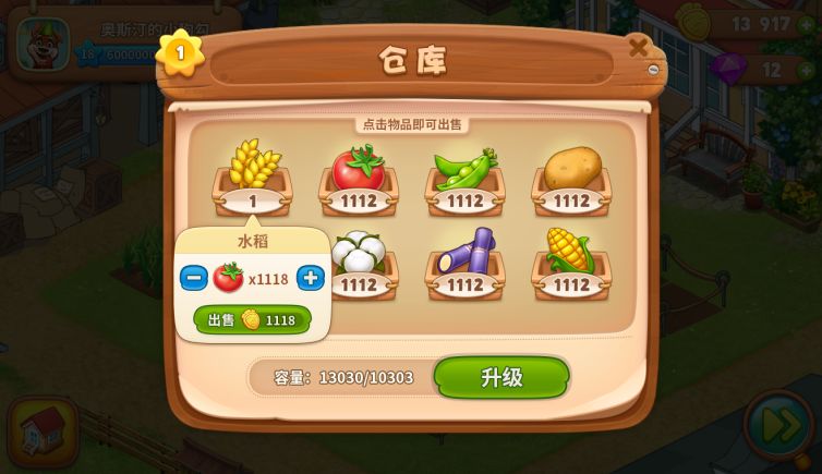 答:仓库可以升级,升级会较大幅度提升仓库的容量。也可以进入仓库,选择一些暂时用不到的收成卖掉,卖掉庄稼也能获得一笔不小的收入。