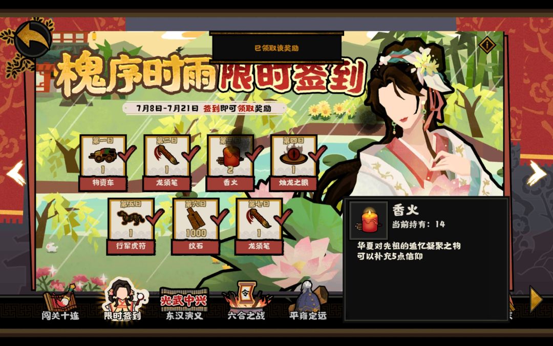 最后,如果觉得这游戏一局时间太长,在开荒完后,当挂机收菜游戏也很好,有空每天春秋席卷,名臣半月五星,没空每天祭祀、产笔,一周稳拿十连以上。