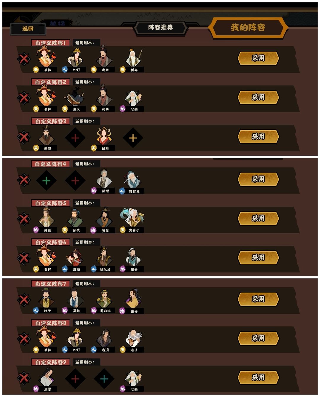 2.攻坚队,用于剧本三星后刷困难,刑天和商鞅配合,不过我贤者一般就是用张良刷秦楚汉。