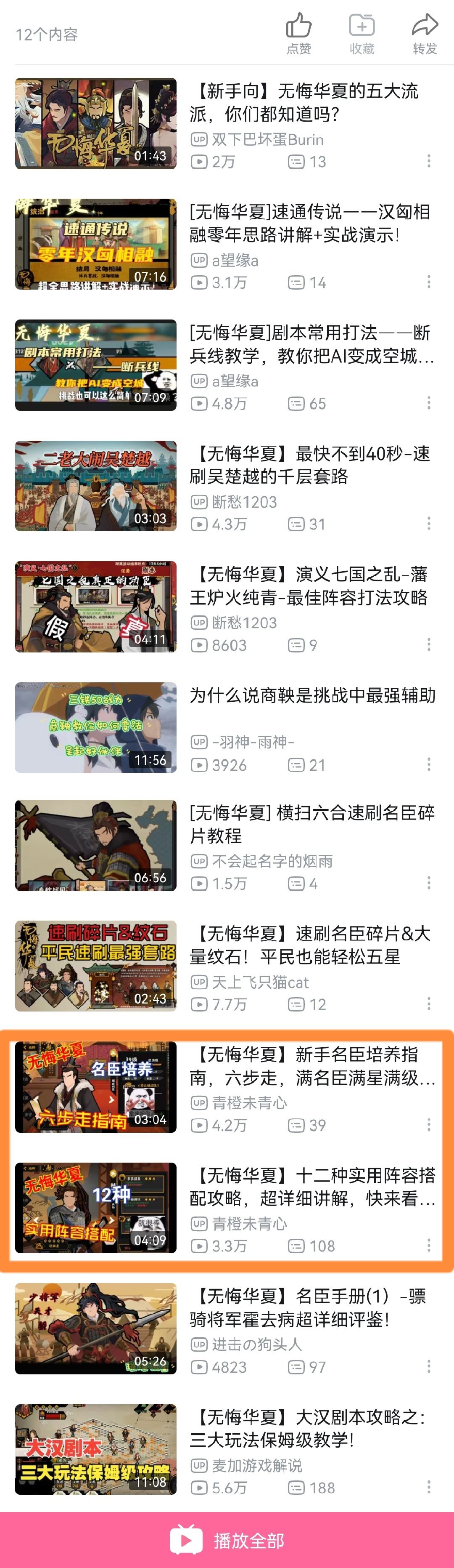 B站视频首推青橙未青心的名臣培养六步走【【无悔华夏】十二种实用阵容搭配攻略,超详细讲解,快来看看吧-哔哩哔哩】、十二常用阵容【【无悔华夏】新手名臣培养指南,六步走,满名臣满星满级不是梦-哔哩哔哩】,新手福音。
