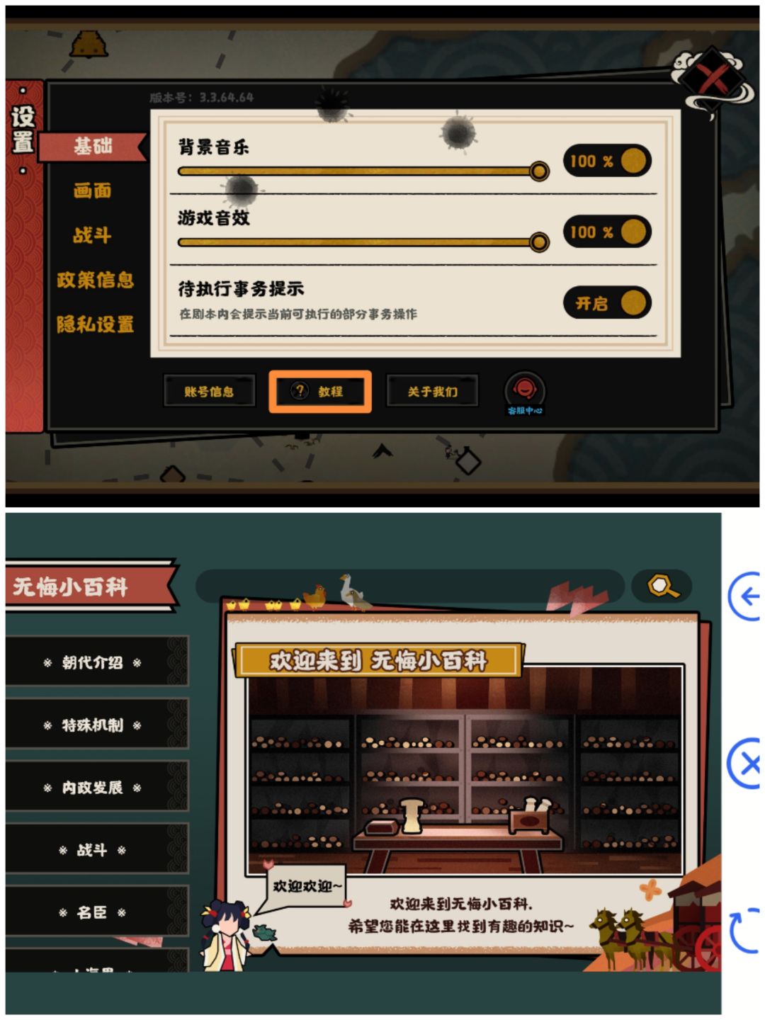 游戏内也有教程,补基础知识,非常有用,像民心、军心、腐化、威望的作用,移动、驻停的用法,各朝代产业,我都是游戏内教程看的。