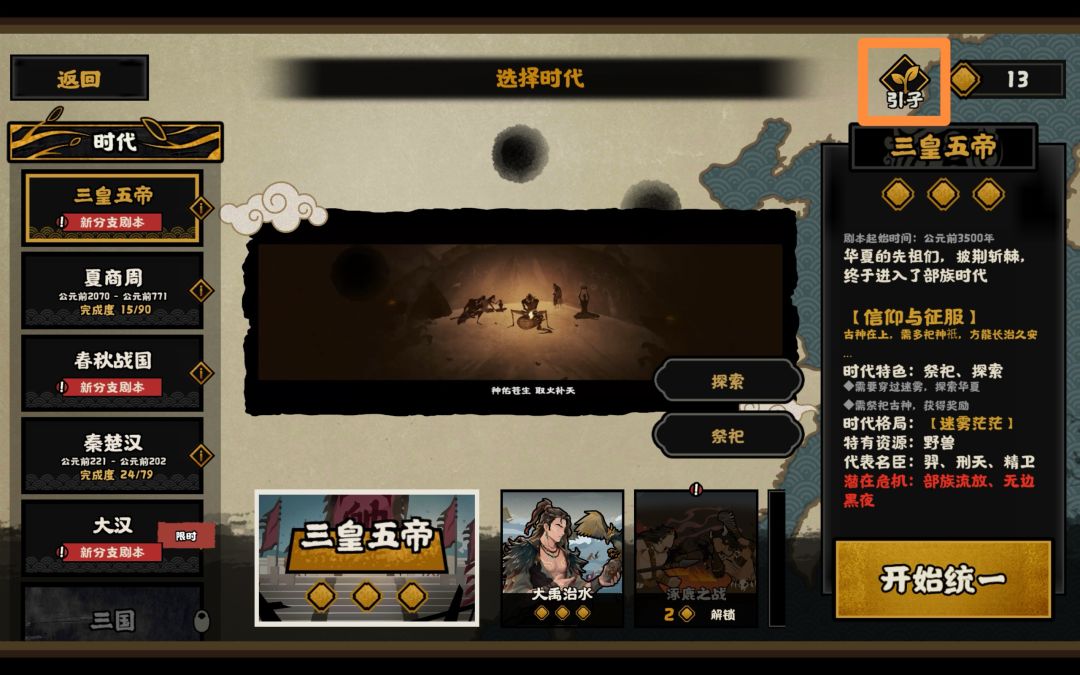 剧本方面,作为新手,我想着打完主线先,要没有活动的话,我不会体验支线和挑战。开荒一周是打了三皇五帝、夏商周、春秋战国、秦楚汉,每个时代特色玩法非常有趣。