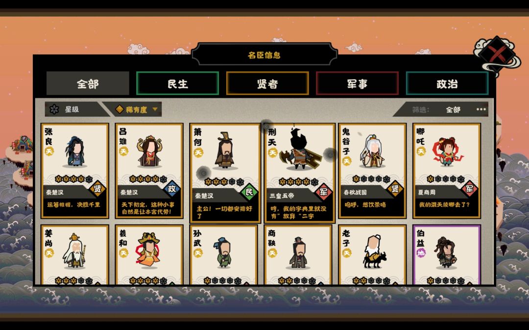 这几天主要刷秦楚汉,一把困难要一坤时,可以提速但我会把好感刷满了再结束,坏处是慢,好处是刷的每一个名臣都有大用,今天萧何三星了。以后考虑刷春秋,更快,而且也能额外刷孔子、管仲这些名臣。