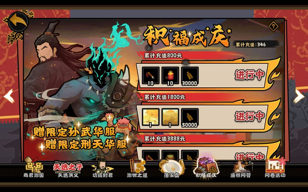 抽卡运气应该算比较好,新手池出刑天,然后不小心开了夏商周池子,二十出了姜尚和哪吒,夏商周应该是大汉以外最难刷的了,姜尚强度也高,对新手友好。