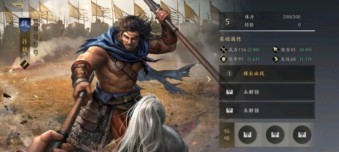 许褚 T799——我不知道总共应该分几个梯度,反正许褚开荒应该是倒数第二个梯度。搭上典韦和曹操的羁绊加成且有铁骑横冲➕净化才勉强能玩,但甚至不如曹操典韦随便搭一个有强度的输出,反正我已经拆了等郭嘉了。刚需战法:铁骑横冲