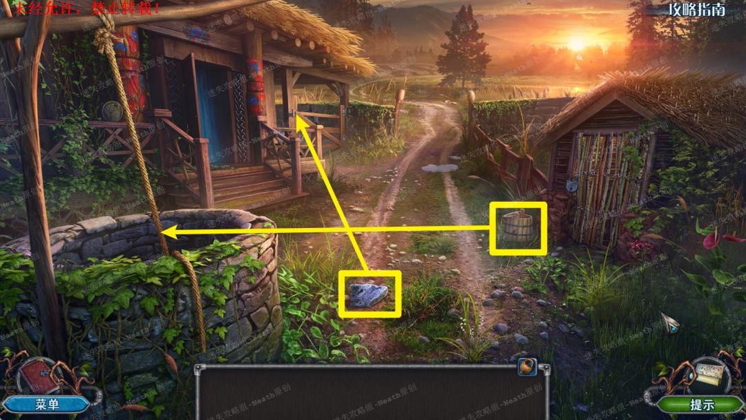 1、捡起路上的【石头】和小屋旁边的【水桶】,使用【水桶】在井里打水,使用【石头】砸开马厩的门。1